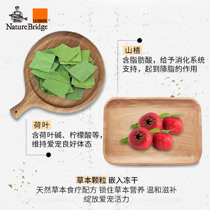雞肉粉,鴨肉粉,大米,豌豆,鴨油,鰹魚粉,啤酒酵母粉,糙米,雞蛋黃粉(1.4%) ,海藻粒(1.4%) ,魚油,山楂,核桃仁,胡蘿卜粒,荷葉